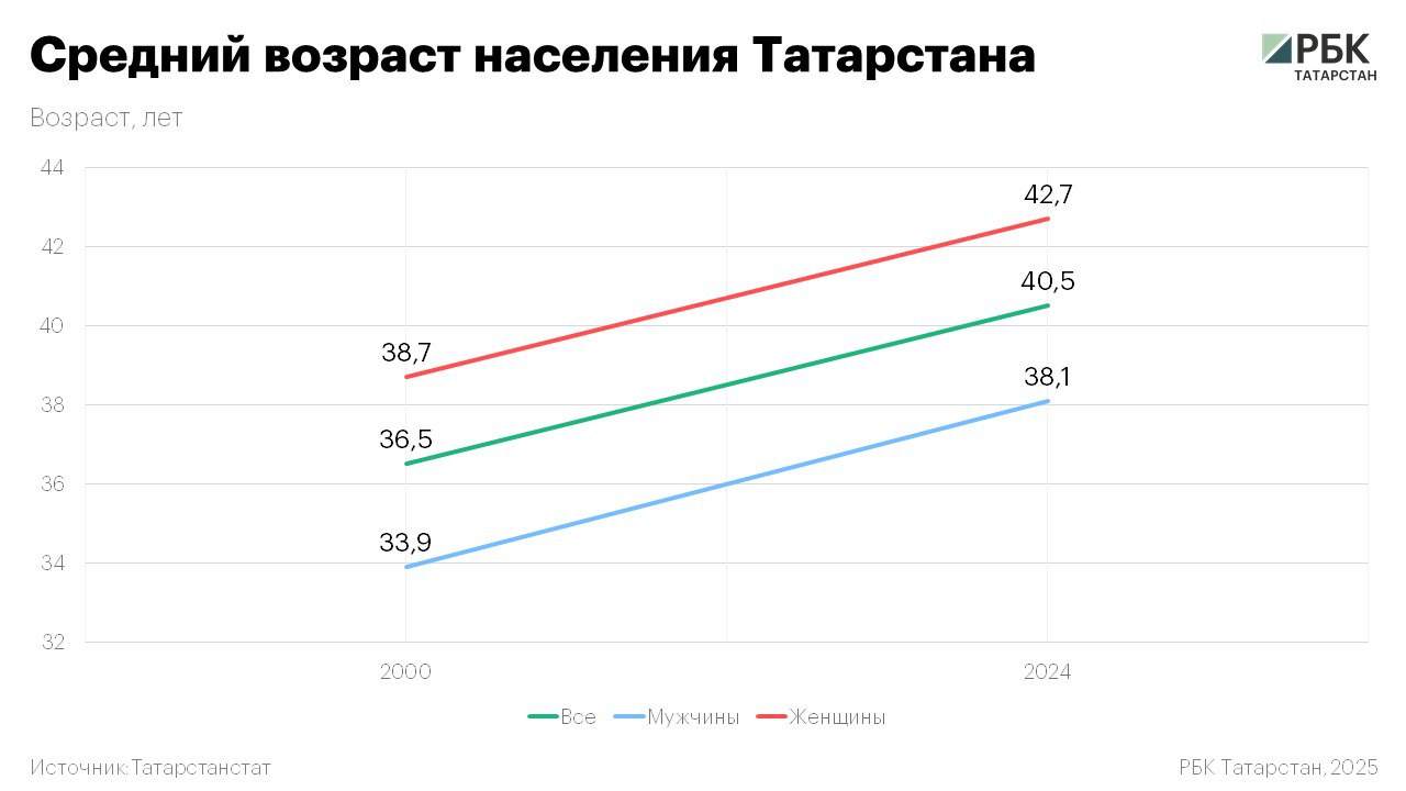 Средний возраст жителя РТ, по данным на начало 2024 года, составил 40,5 года, сообщили РБК Татарстан в пресс-службе Татарстанстата. Без малого за четверть века он вырос ровно на четыре года – в начале 2000-го этот показатель оценивался в 36,5 года.