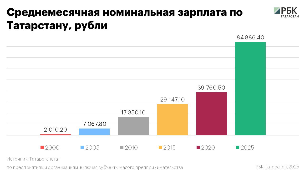 По данным Татарстанстата, средняя номинальная зарплата в республике в 2000 году составляла чуть более 2 тыс. руб., а по итогам января-августа 2025-го – порядка 84,9 тыс. Таким образом, за четверть века она выросла на 4122% или в 42 раза. Данные приведены по предприятиям и организациям, включая субъекты малого предпринимательства.