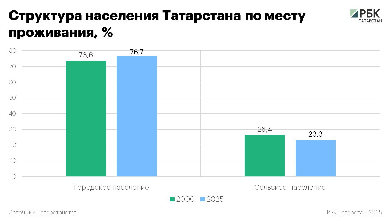 Доля сельского населения, соответственно, снизилась. В начале 2000 года сельчанами были больше четверти жителей Татарстана (26,4%). К 2025 году их доля уменьшилась до 23,3%.